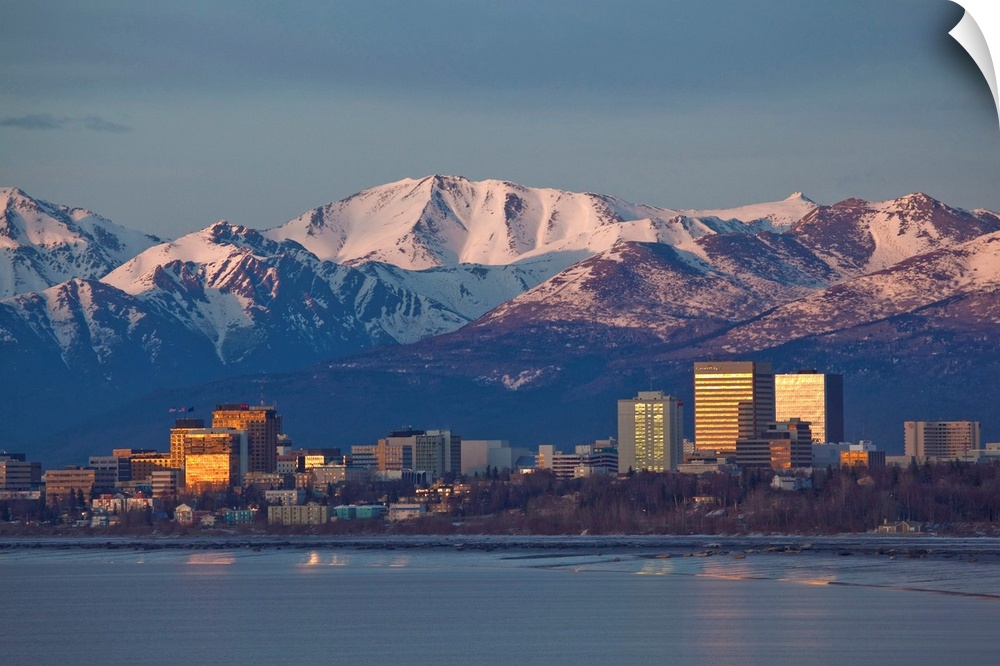<p>Chugach mountain range seen behind a wide angle view of downtown Anchorage with mudflats in the foreground.</p>