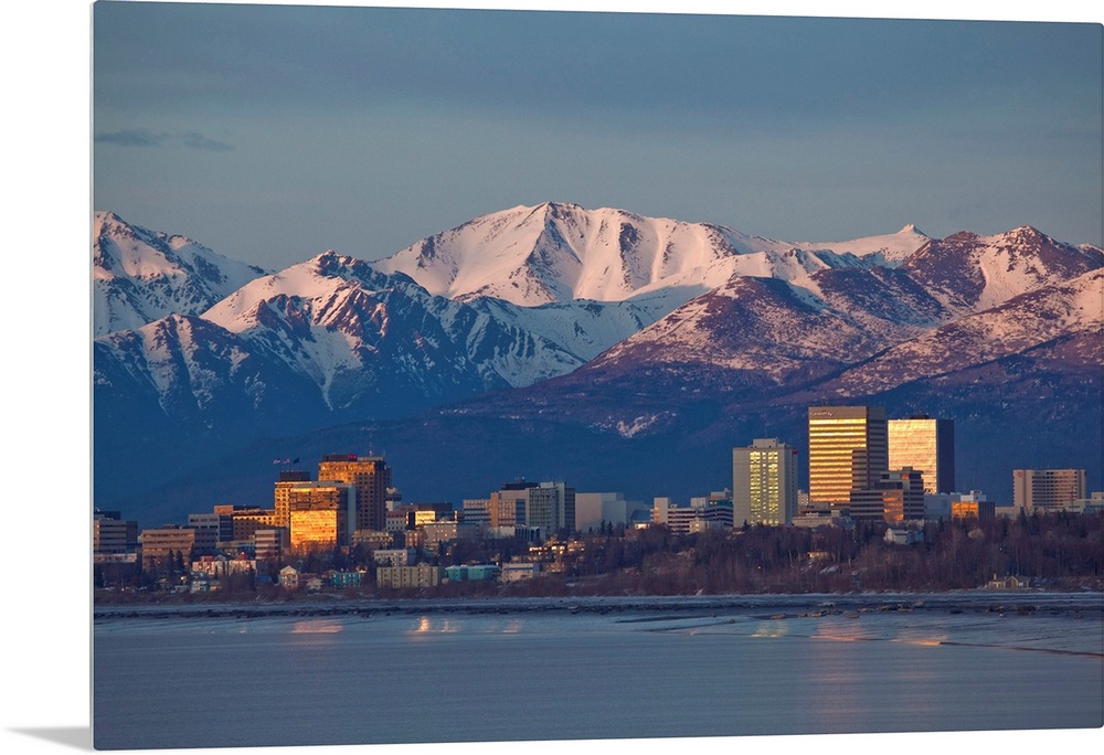 <p>Chugach mountain range seen behind a wide angle view of downtown Anchorage with mudflats in the foreground.</p>