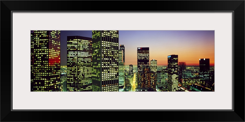 <p>Panoramic photo of an illuminated cityscape up close to the buildings at sunset.</p>