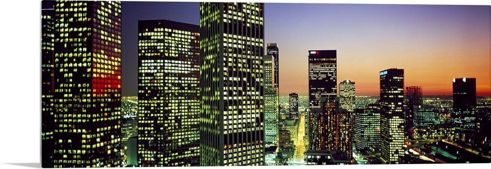 <p>Panoramic photo of an illuminated cityscape up close to the buildings at sunset.</p>