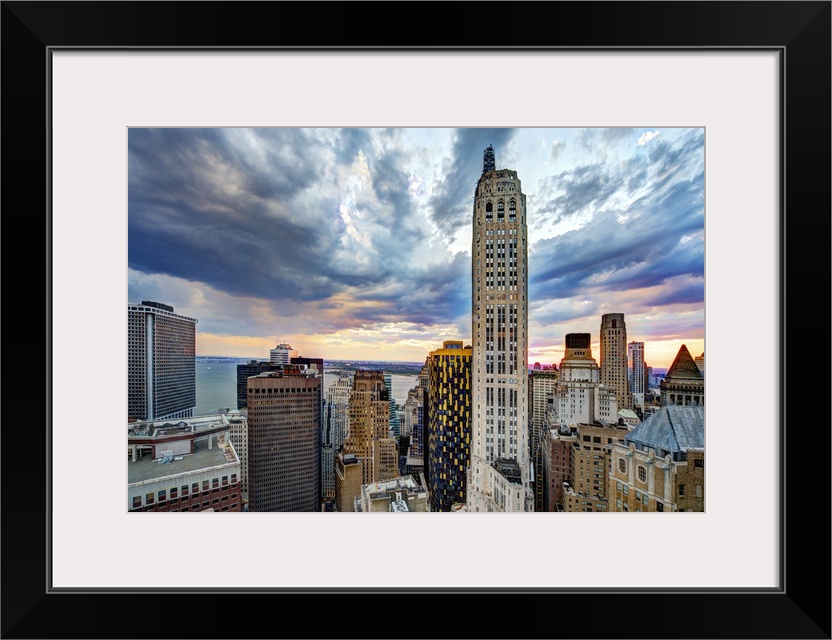 <p>Taken from 75 Wall St looking south at New York harbor, Downtown/lower manhattan skyline, Goldman Sachs Building, One New York Plaza Building. Cloudy</p>