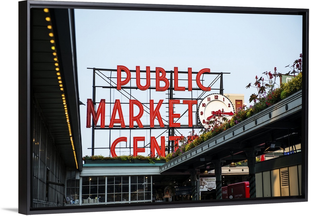 <p>Photograph of the downtown farmers market sign at Pike Place Market in Seattle</p>