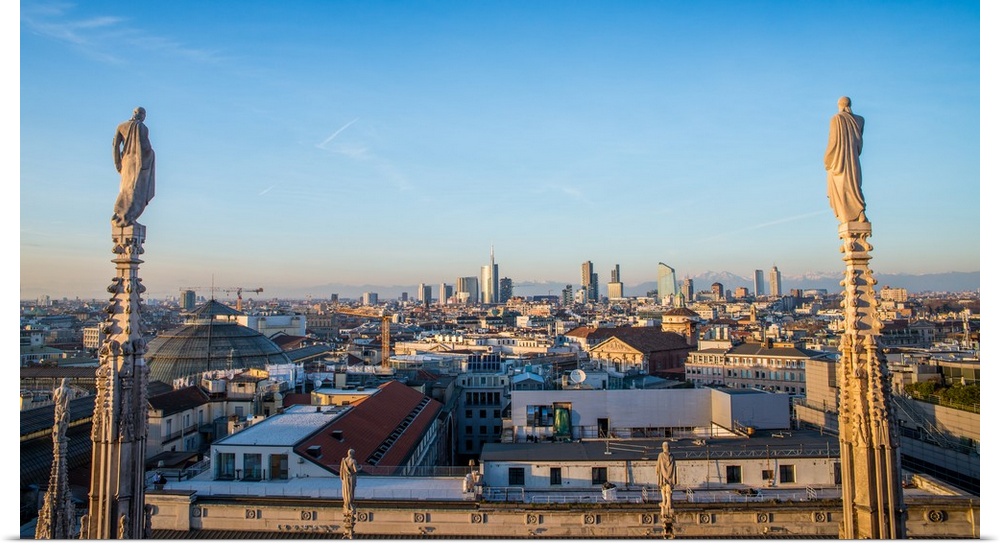 <p>Downtown Milan as seen through the roof of the city's famous Duomo cathedral, Milan, Lombardy, Italy</p>