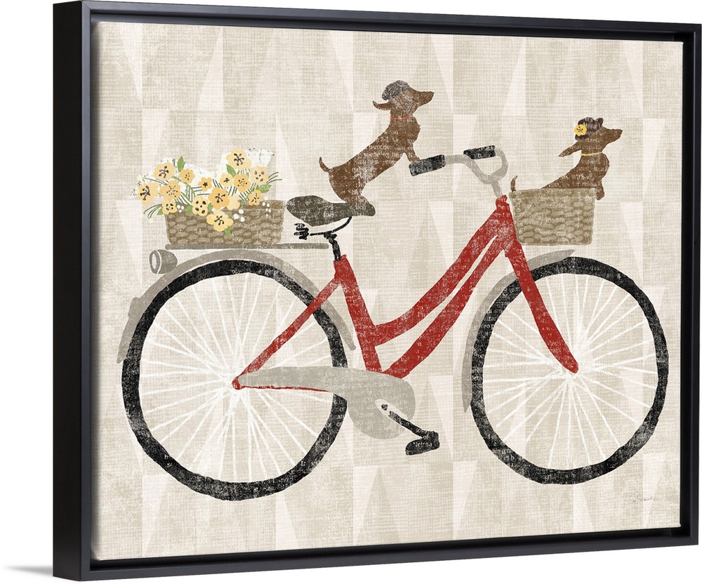 <p>Decorative artwork of two dachshunds riding a red bicycle with a neutral backdrop.</p>