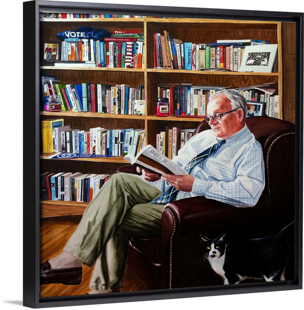 <p>A contemporary watercolor painting of an associate professor of education at Culver-Stockton College in Missouri, sitting in a chair reading a book as a cat walks by.</p>