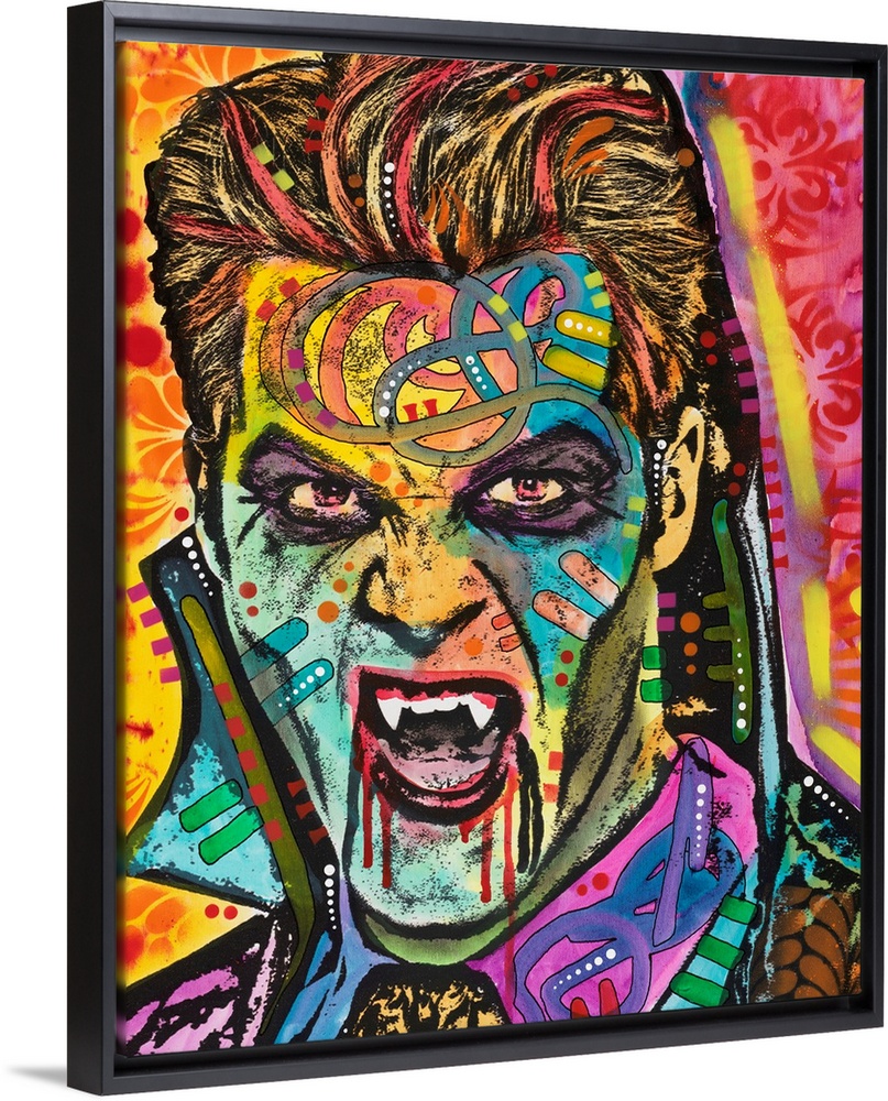 <p>Pop art style painting of Dracula in different colors and abstract designs.</p>