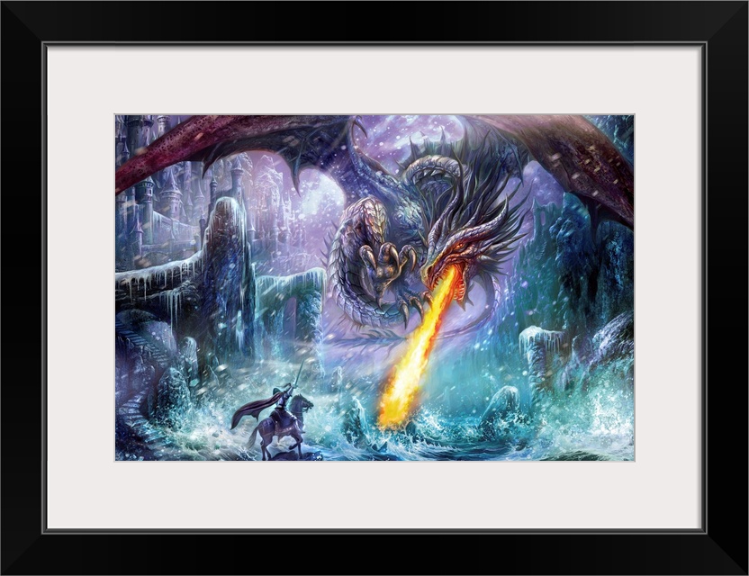 <p>Fantasy style artwork with a dragon breathing fire while a soldier on a horse raises his sword as to battle with it. They are surrounded by a castle and rock formations covered with ice and snow.</p>