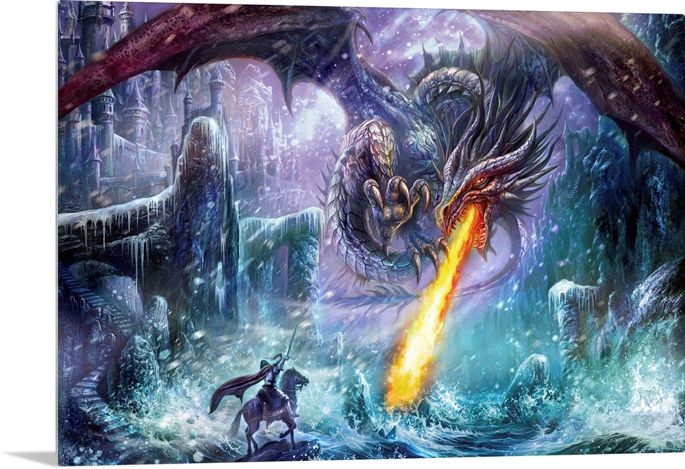 <p>Fantasy style artwork with a dragon breathing fire while a soldier on a horse raises his sword as to battle with it. They are surrounded by a castle and rock formations covered with ice and snow.</p>