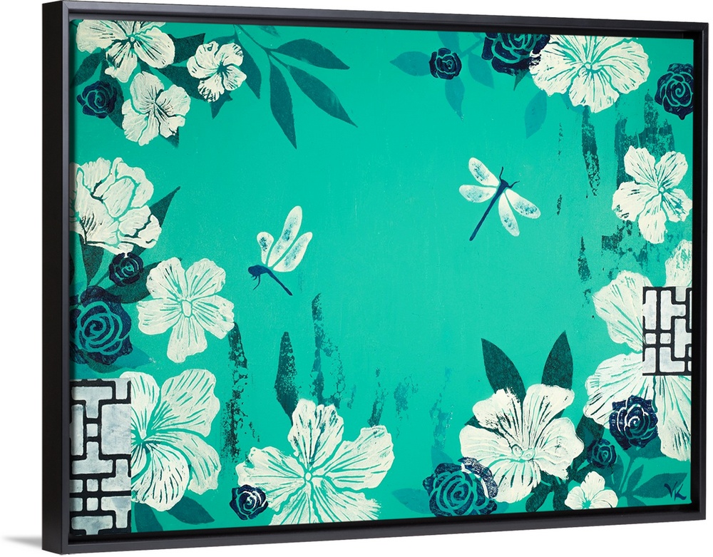 <p>Painting of two dragonflies flying in garden of hibiscus with turqoise background.</p>