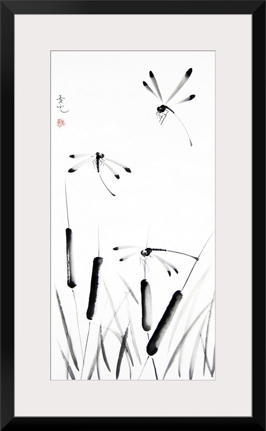<p>Chinese ink painting of cattails and dragonflies.</p>