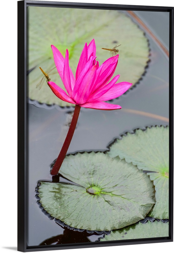 <p>Dragonfly resting on blossoming fuchsia lotus (nelumbo) plant, Udon Thani, Thailand.</p>