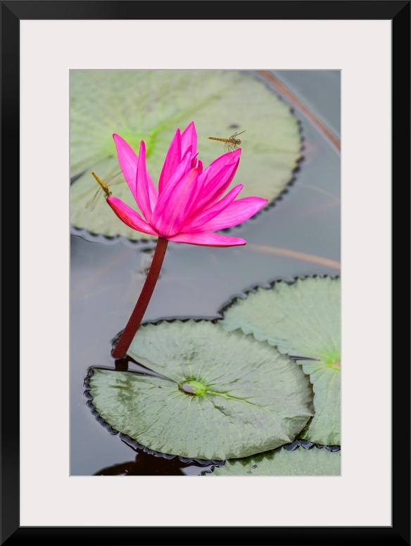 <p>Dragonfly resting on blossoming fuchsia lotus (nelumbo) plant, Udon Thani, Thailand.</p>