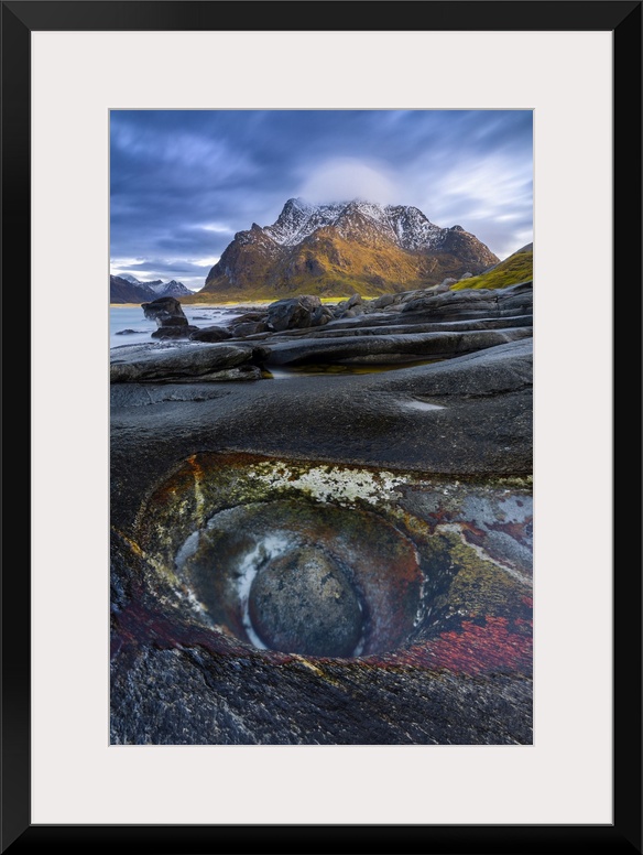 <p>Dragon's eye at Uttakleiv beach at sunset, Leknes, Vestvagoy, Lofoten, Nordland, Norway, Scandinavia, Nothern Europe</p>
