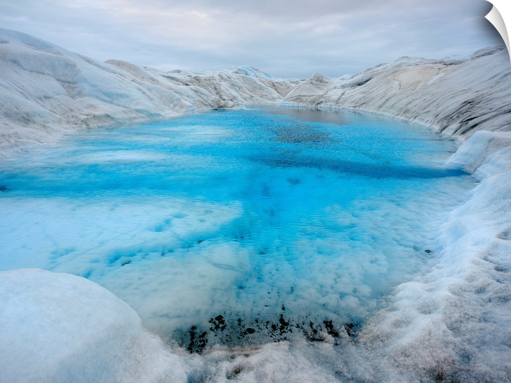 <p>Drainage system with lake on the surface of the ice sheet. The brown sediment on the ice is created by the rapid melting of the ice. Landscape of Greenland near Kangerlussuaq, Kingdom of Denmark.</p>