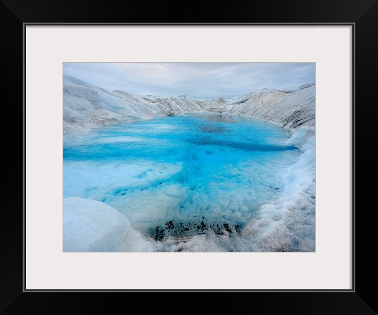 <p>Drainage system with lake on the surface of the ice sheet. The brown sediment on the ice is created by the rapid melting of the ice. Landscape of Greenland near Kangerlussuaq, Kingdom of Denmark.</p>