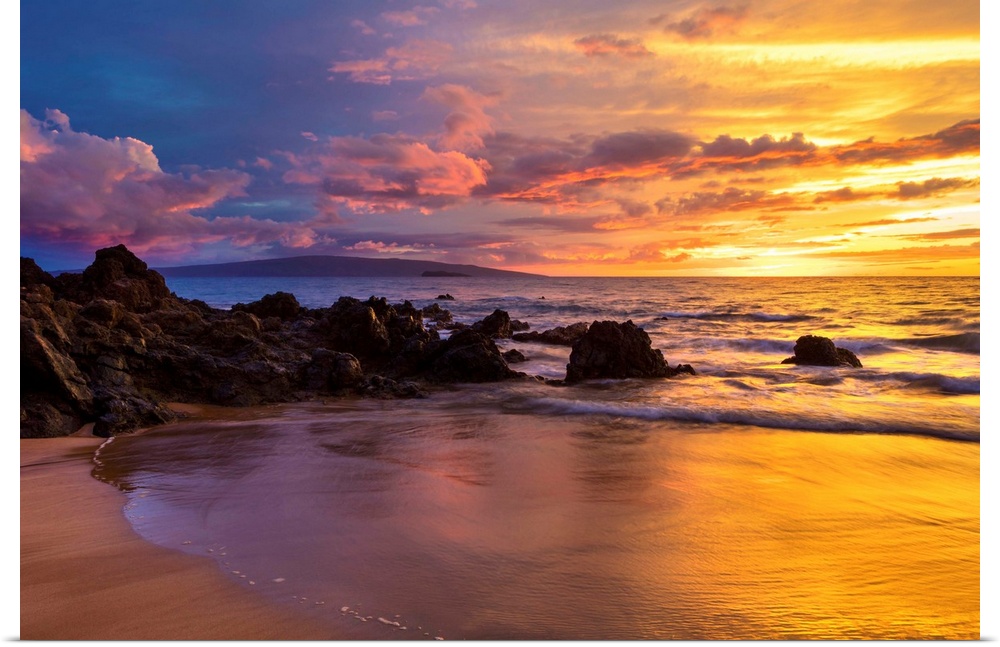 <p>Dramatic clouds during a sunset on a beach; Makena, Maui, Hawaii, United States of America.</p>