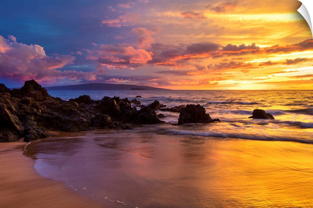 <p>Dramatic clouds during a sunset on a beach; Makena, Maui, Hawaii, United States of America.</p>