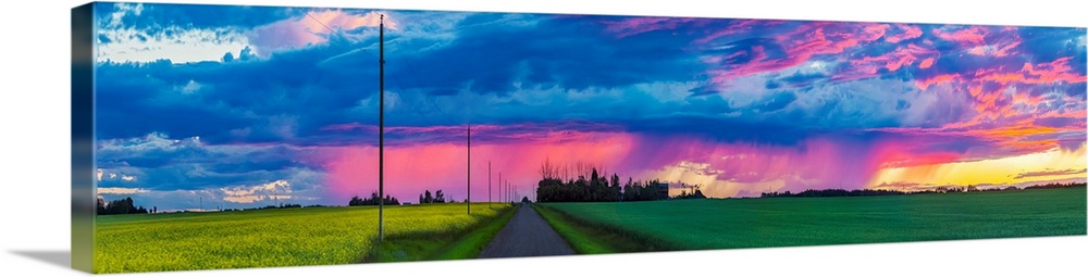 <p>Dramatic colourful sky at sunset over green farmland and a country road; Alberta, Canada</p>