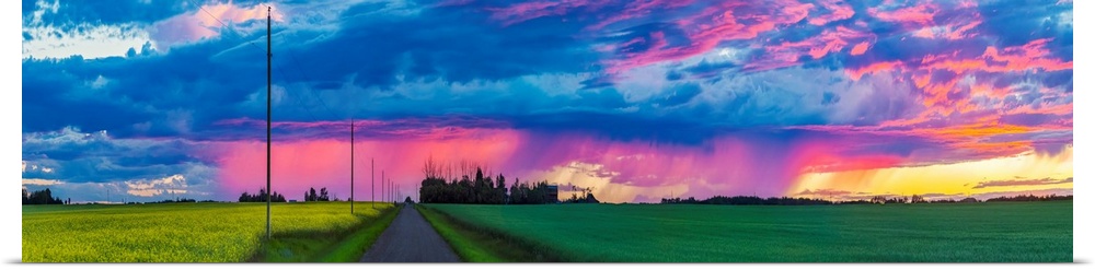 <p>Dramatic colourful sky at sunset over green farmland and a country road; Alberta, Canada</p>