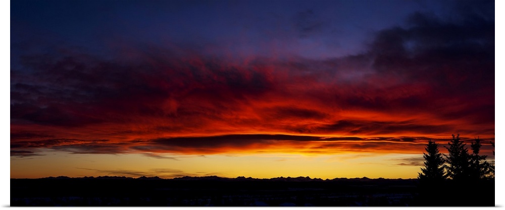 <p>Dramatic colourful sky/clouds at sunset with silhouette trees and mountain range in background; Calgary, Alberta, Canada.</p>