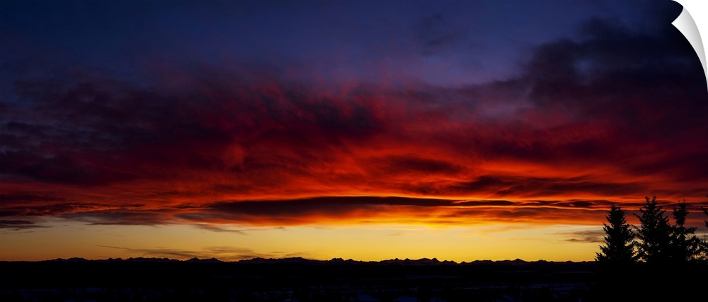 <p>Dramatic colourful sky/clouds at sunset with silhouette trees and mountain range in background; Calgary, Alberta, Canada.</p>