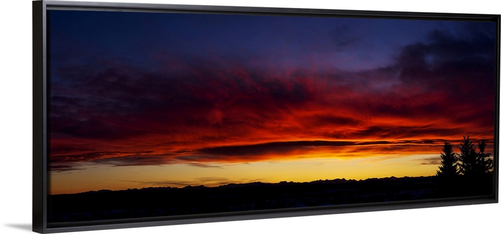 <p>Dramatic colourful sky/clouds at sunset with silhouette trees and mountain range in background; Calgary, Alberta, Canada.</p>