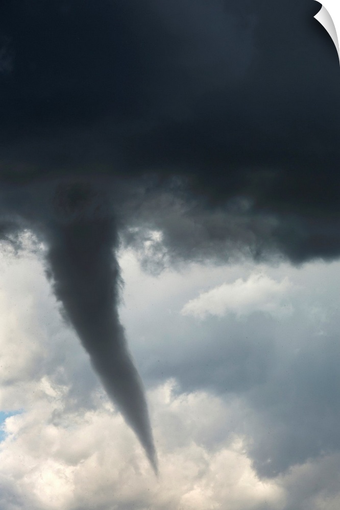 <p>Dramatic funnel cloud created in dark storm clouds. Calgary, Alberta, Canada.</p>