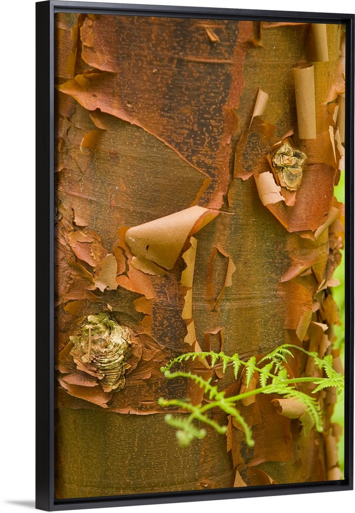 <p>Dramatic pattern and color in peeling paperbark with fern</p>