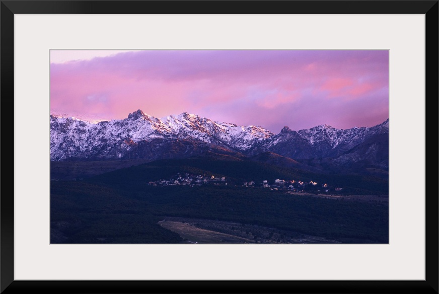 <p>Dramatic purple sunset above snowy rugged summits of Los Cumbres Verdes, part of the Sierra Nevada, viewed from Granada, Andalucia, Spain</p>