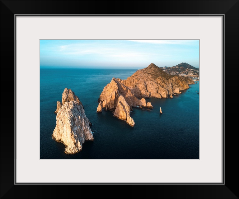 <p>Dramatic rock formations on the southern tip of the Baja Peninsula called Lands End from the air at sunset with the resort city of Cabo San Lucas in the background, Cabo San Lucas, Baja California Sur, Mexico</p>