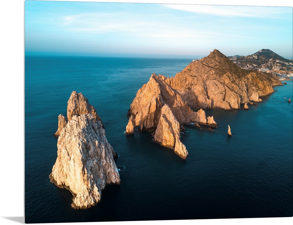 <p>Dramatic rock formations on the southern tip of the Baja Peninsula called Lands End from the air at sunset with the resort city of Cabo San Lucas in the background, Cabo San Lucas, Baja California Sur, Mexico</p>