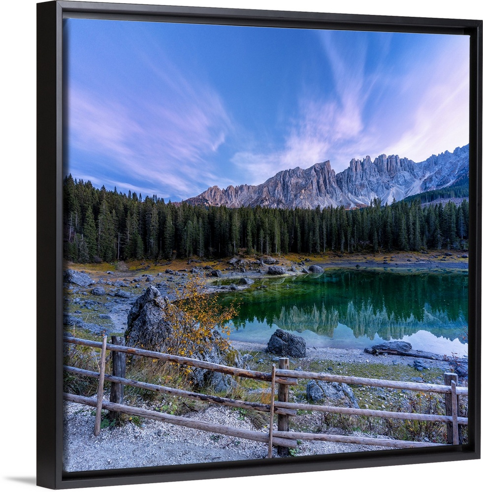 <p>Dramatic sky at sunset over Carezza Lake and Latemar peaks in autumn, Dolomites, South Tyrol, Italy, Europe</p>