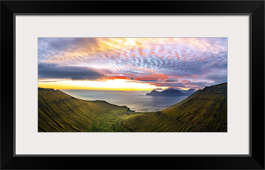 <p>Dramatic sky with clouds at sunrise over the coastal village of Gjogv, aerial view, Eysturoy Island, Faroe Islands, Denmark, Europe</p>