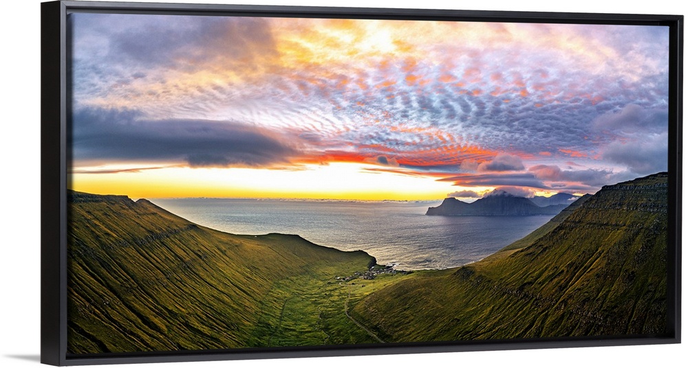 <p>Dramatic sky with clouds at sunrise over the coastal village of Gjogv, aerial view, Eysturoy Island, Faroe Islands, Denmark, Europe</p>