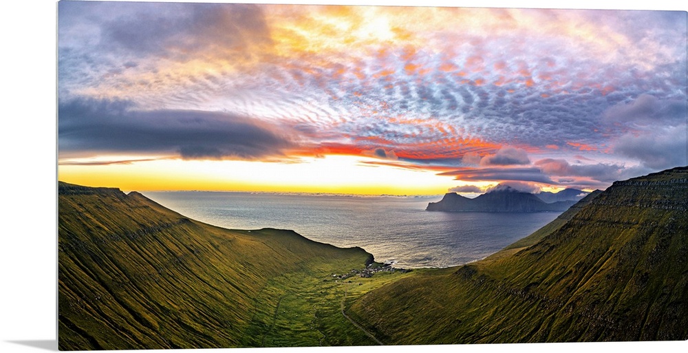 <p>Dramatic sky with clouds at sunrise over the coastal village of Gjogv, aerial view, Eysturoy Island, Faroe Islands, Denmark, Europe</p>