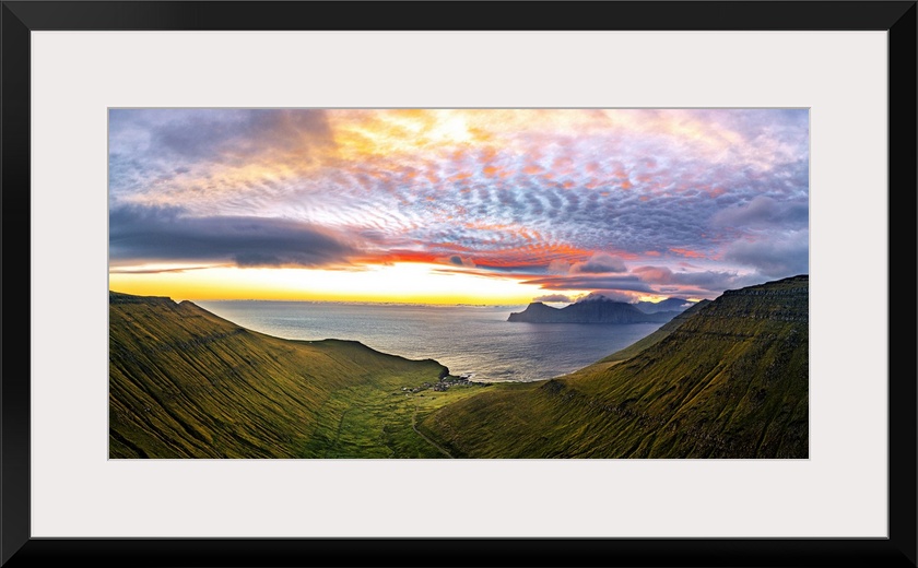 <p>Dramatic sky with clouds at sunrise over the coastal village of Gjogv, aerial view, Eysturoy Island, Faroe Islands, Denmark, Europe</p>