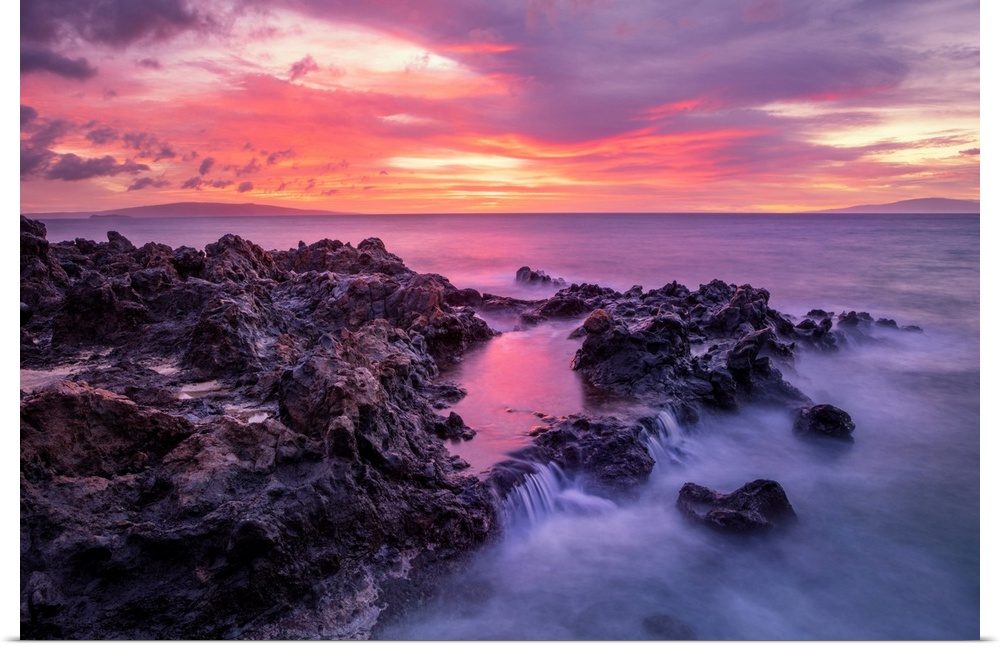 <p>Dramatic sunset over the ocean with waterfalls along the rugged coastline; Wailea, Maui, Hawaii, United States of America</p>