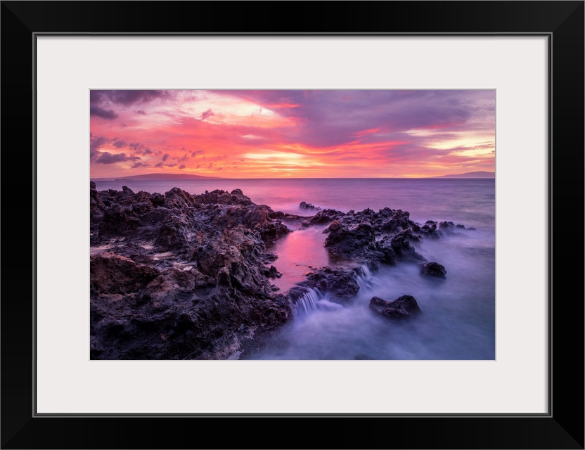 <p>Dramatic sunset over the ocean with waterfalls along the rugged coastline; Wailea, Maui, Hawaii, United States of America</p>