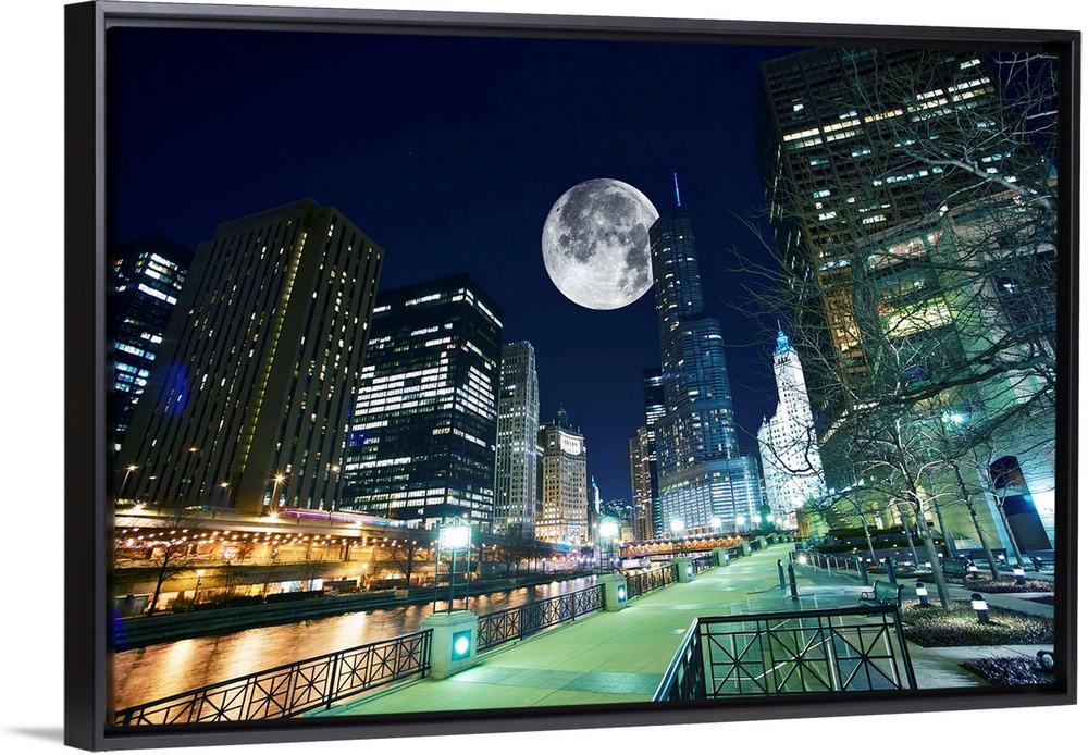 <p>Chicago at Night. Shot Taken from Chicago Famous Riverwalk. Large Moon on the Sky.</p>