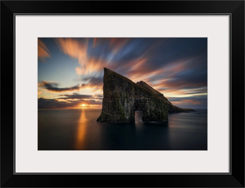 <p>Drangarnir rocky arch on Vagar island in sunset, Faroe Islands, Denmark</p>