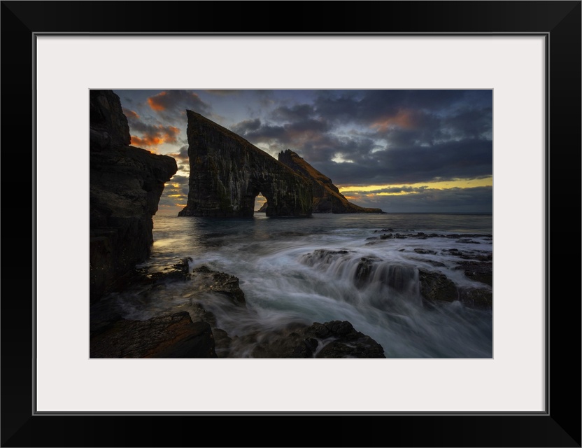 <p>Drangarnir rocky arch on Vagar island in sunset, Faroe Islands, Denmark</p>