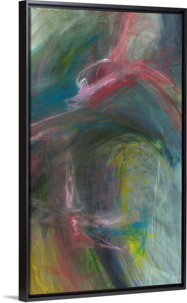 <p>Large abstract art with dark and muted hues in shades of pink, yellow, blue, and green.</p>