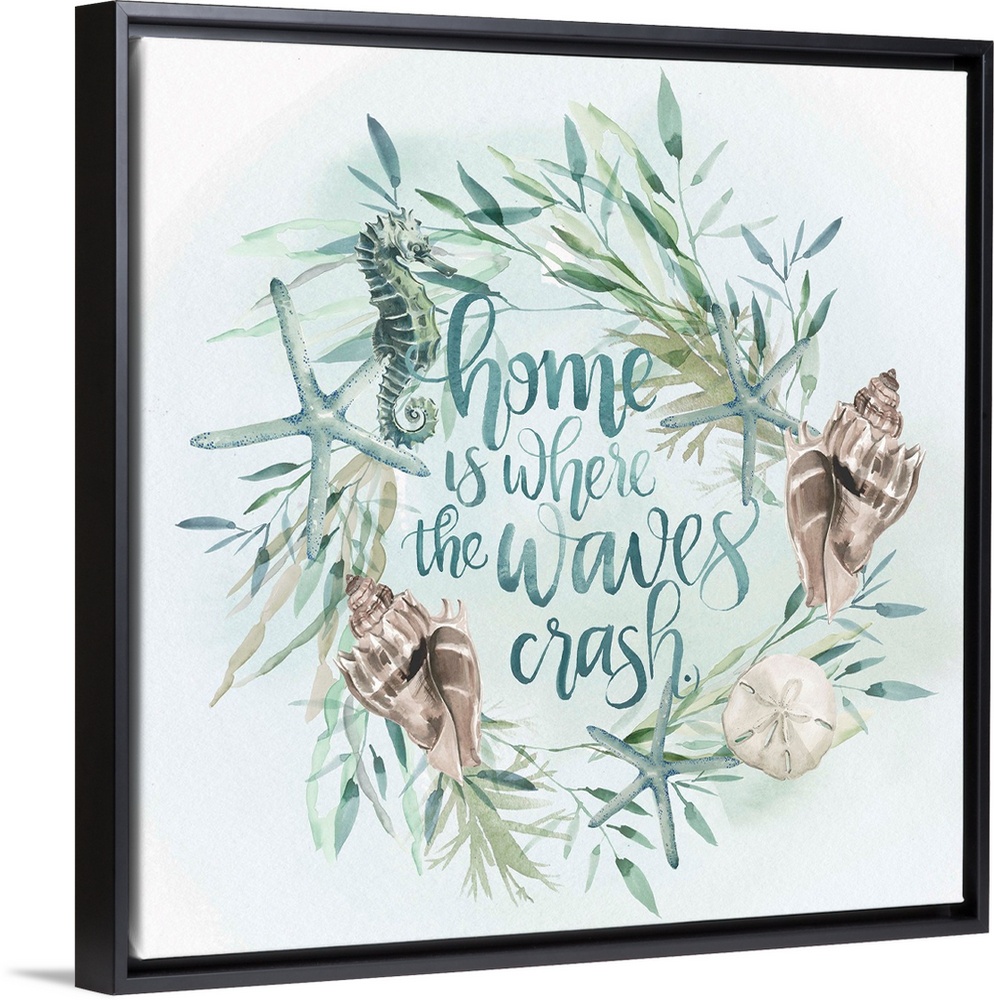 <p>Beach-themed wreath with text "Home is where the waves crash" in watercolor.</p>