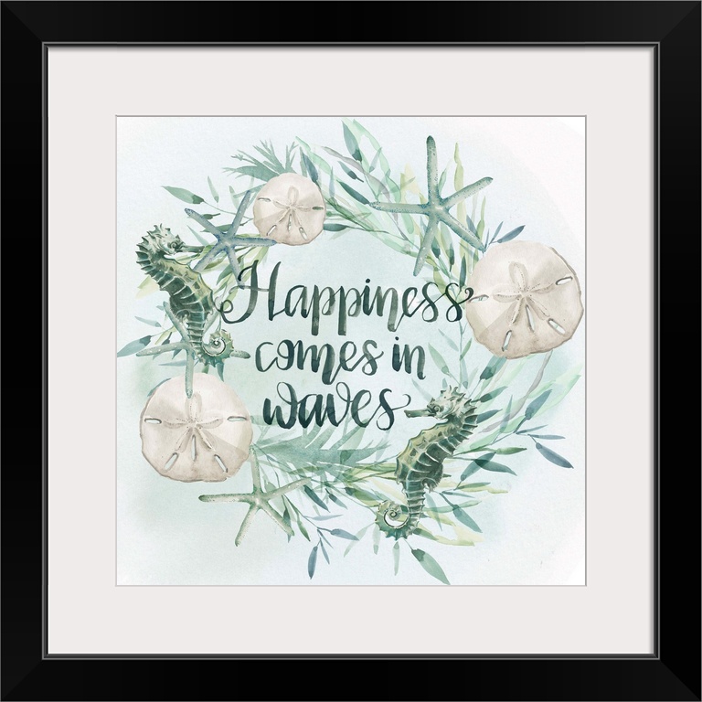 <p>Beach-themed wreath with text "Happiness comes in waves" in watercolor.</p>