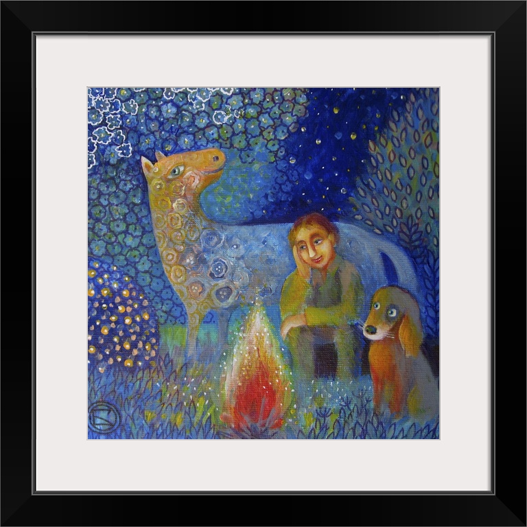 <p>Contemporary painting of an evening scene with a person, dog, and horse around a fire.</p>