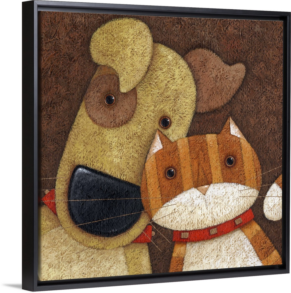 <p>Contemporary painting of a dog with a spot over his eye next to an orange striped cat.</p>