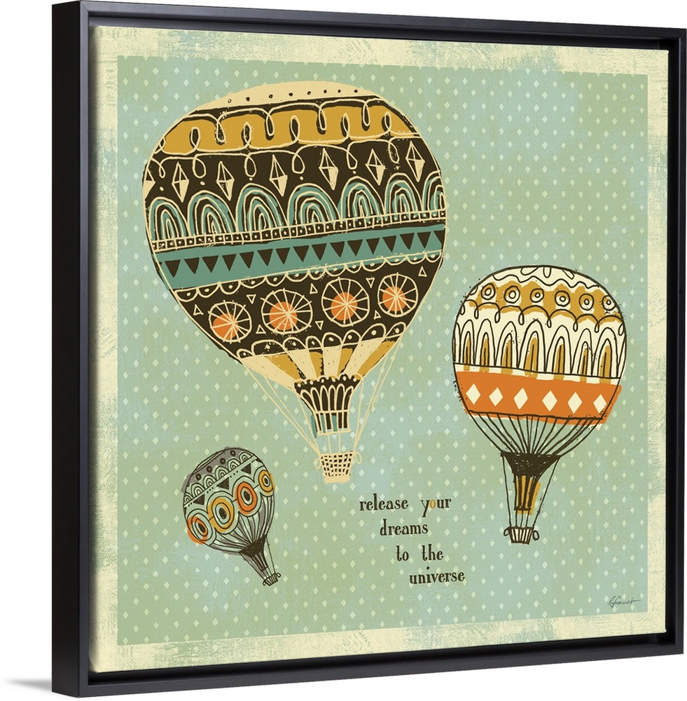 <p>Contemporary illustration with a retro feel of hot air balloons floating against a diamond patterned background.</p>
