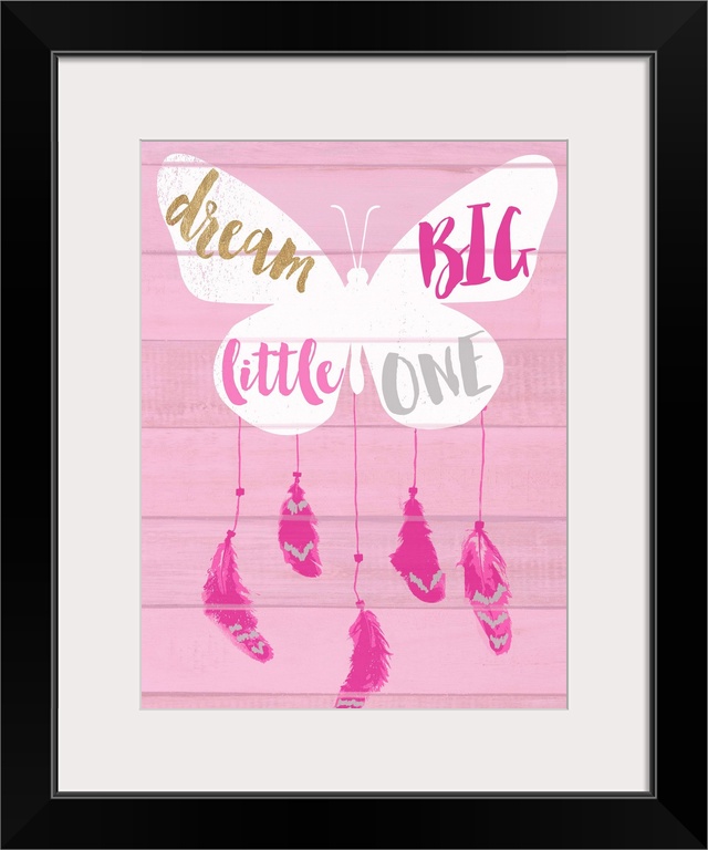 <p>"Dream Big Little One" written on butterfly wings with feathers dangling on the bottom, resembling a dream catcher.</p>