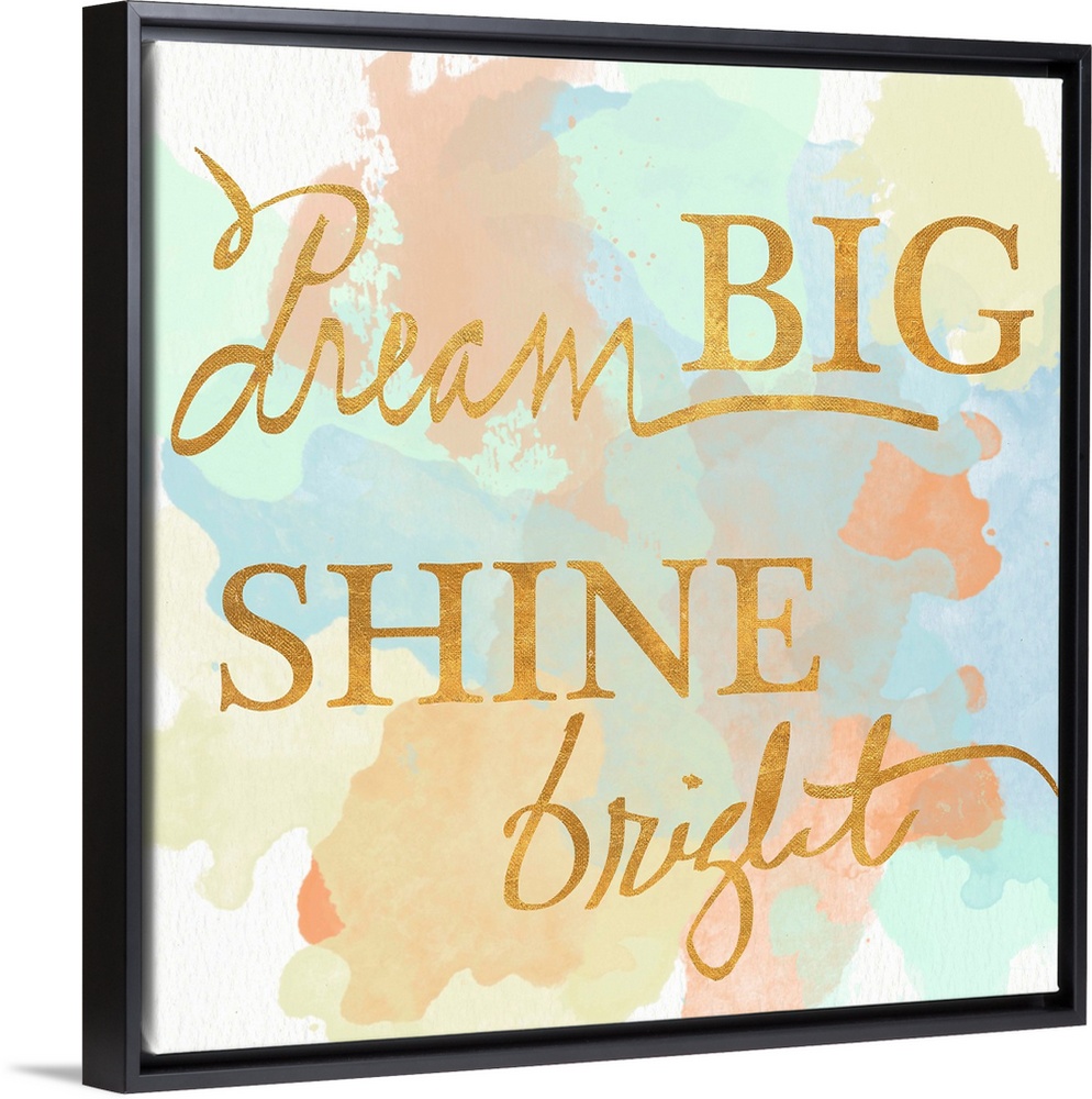 <p>"Dream Big Shine Bright" written in a shiny gold font on a pastel colored watercolor background.</p>