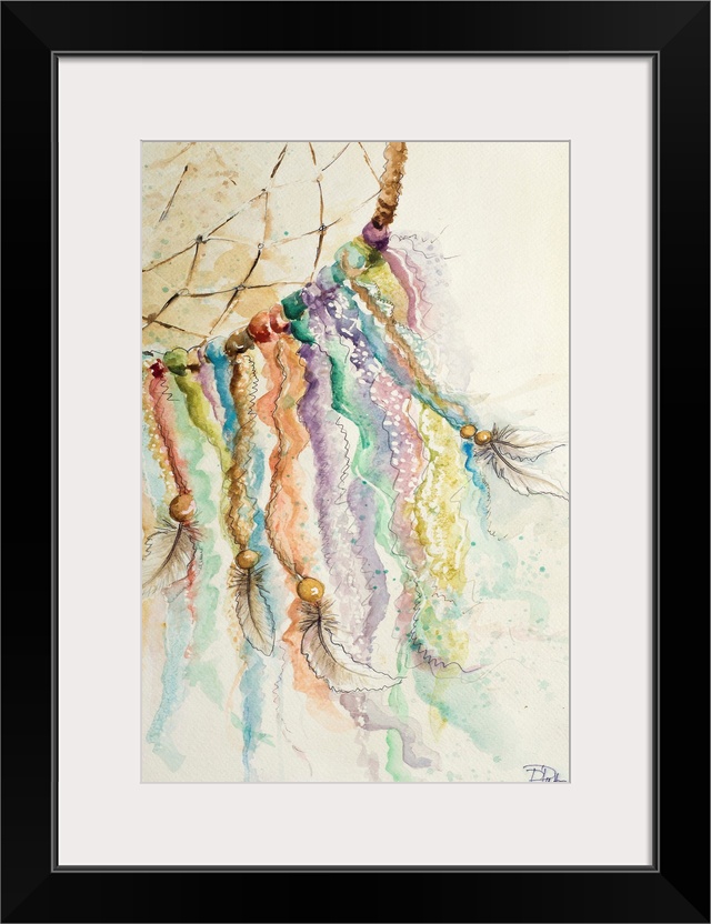 <p>Painting of a dream catcher with cords of varying color and feathers tied to the ends.</p>
